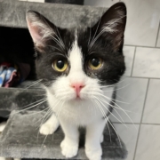 Deze zwart met witte lieverd is Robijn, zijn geschatte geboortedatum is 16 maart 2025. Robijn is zwervend gevonden en helaas heeft zich niemand voor hem gemeld.