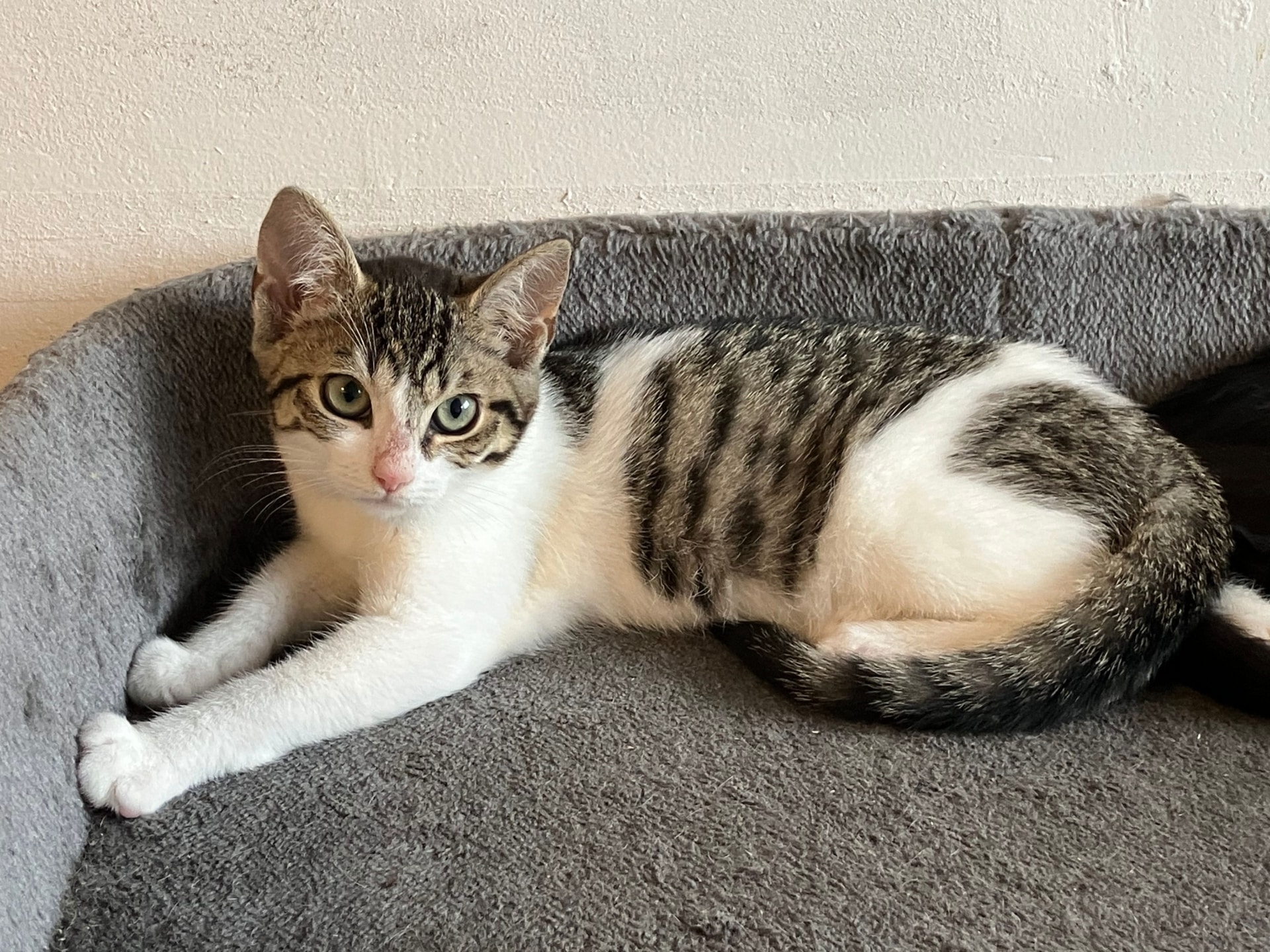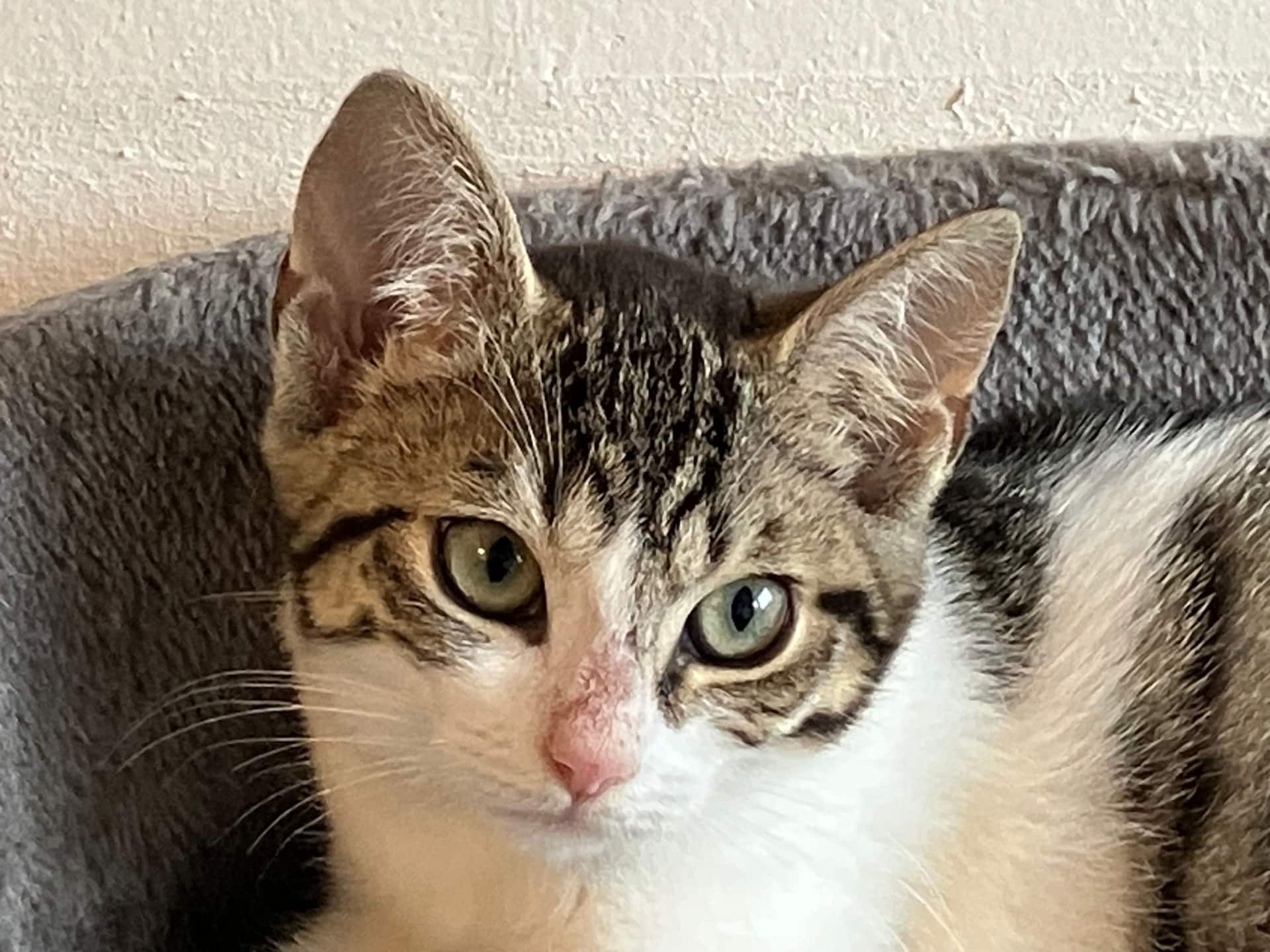 Zodra je iets van haar wil, duikt ze snel weg, dus ze heeft nog wel een weg te gaan. Maar kittens zijn erg veerkrachtig dus we vermoeden dat ze in een rustig huishouden, waar ze alle tijd en ruimte krijgt, snel ‘om’ is.