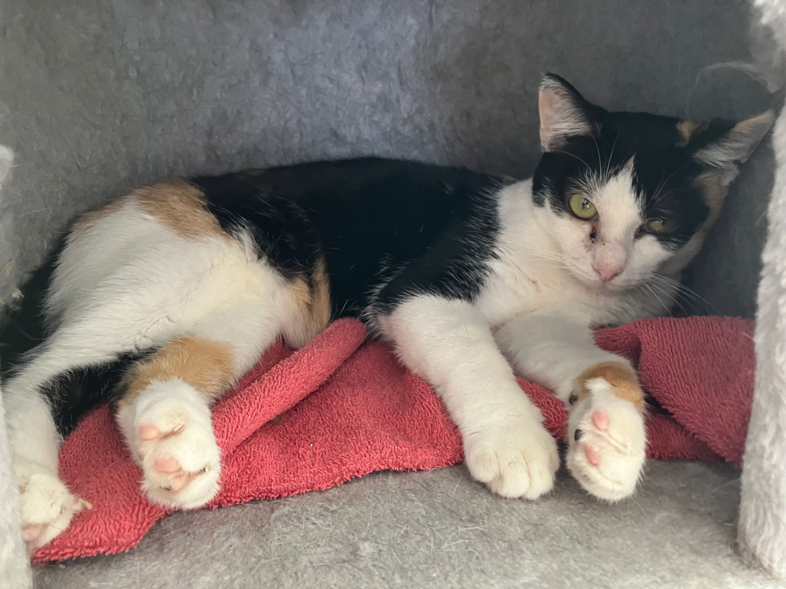 Dit lapjespoes is Geeke, haar geschatte geboortedatum is 19 december 2024. Geeke is terughoudend, maar ook nieuwsgierig.