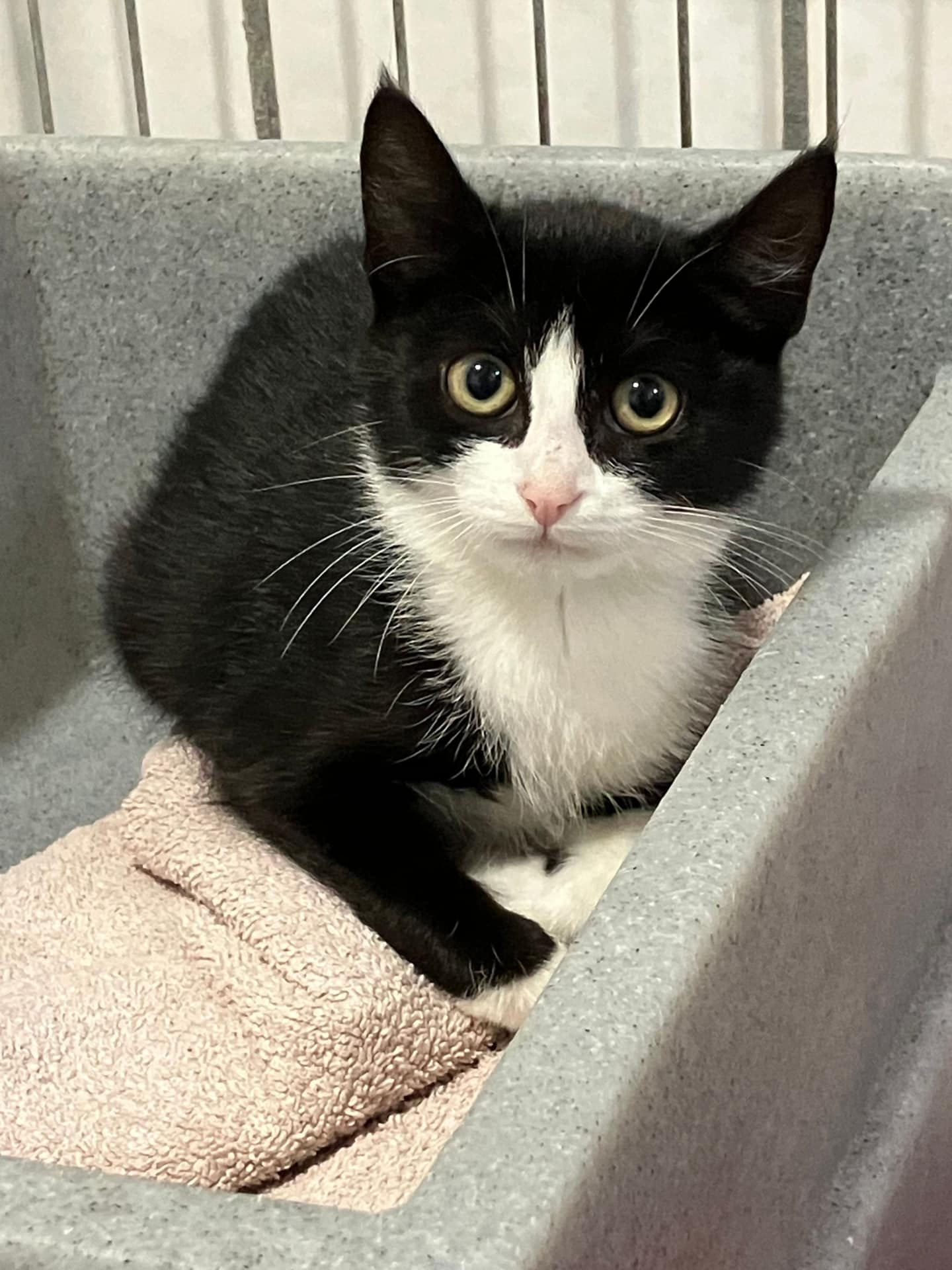 Dit is Mies met haar mooie zwarte boevenmasker. Ze heeft een geschatte geboortedatum van 5-4-2025 en is gevonden op straat. Helaas heeft niemand haar opgehaald dus ze wacht nu op een nieuw huisje.