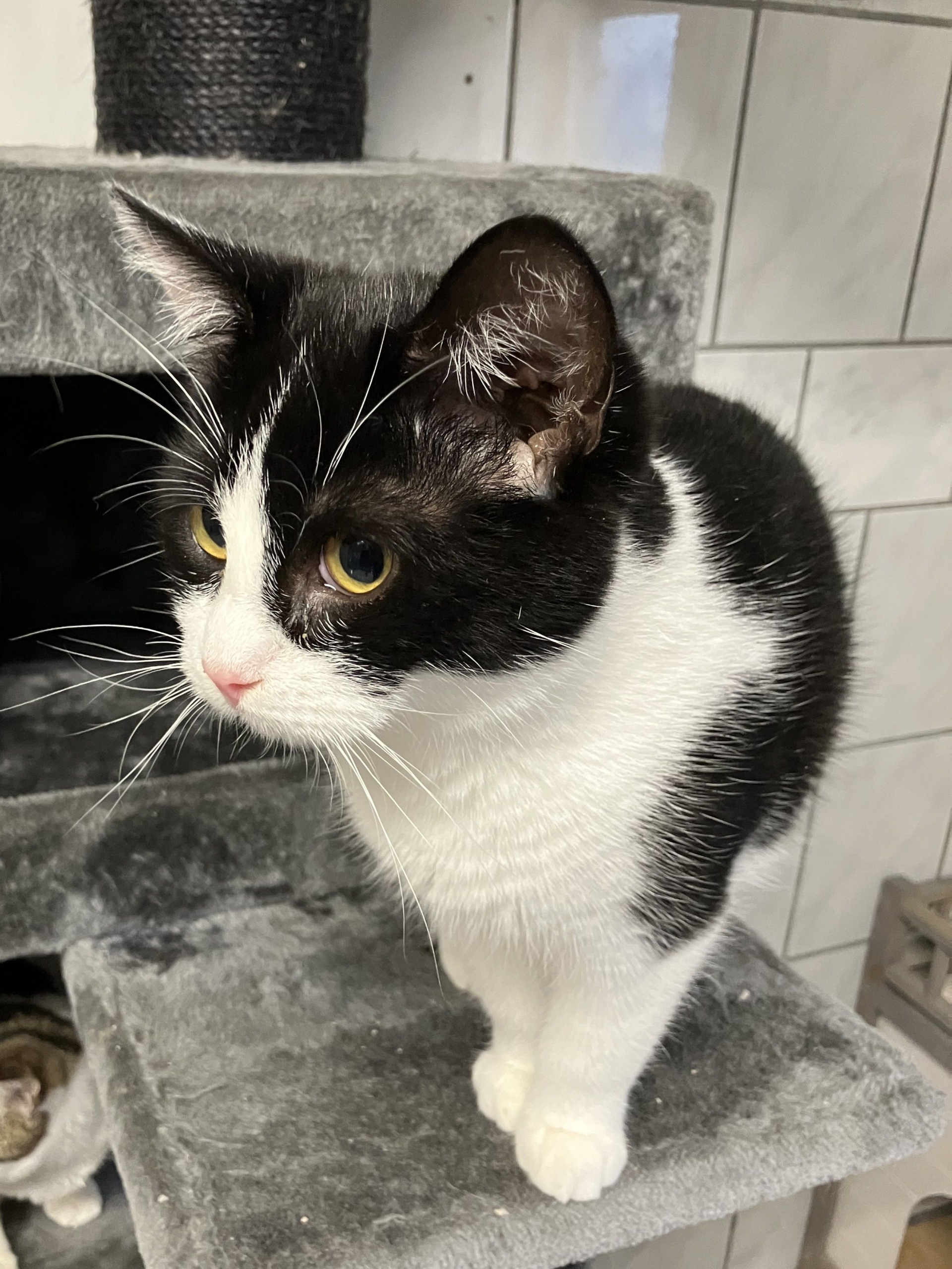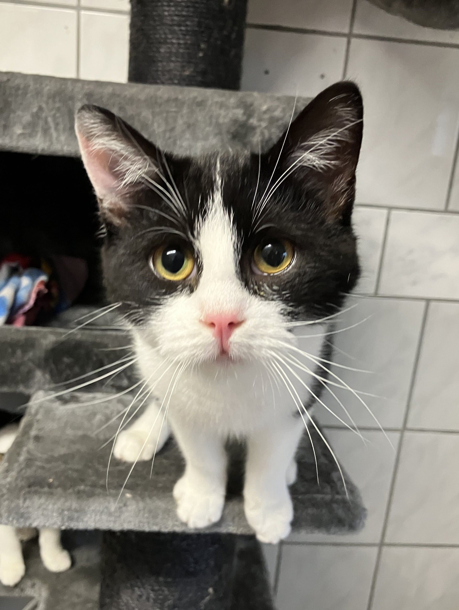 Deze zwart met witte lieverd is Robijn, zijn geschatte geboortedatum is 16 maart 2025. Robijn is zwervend gevonden en helaas heeft zich niemand voor hem gemeld.