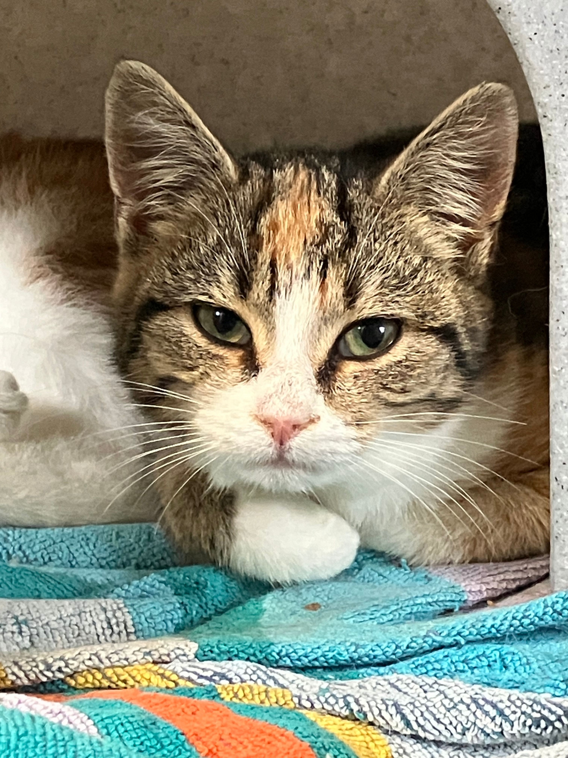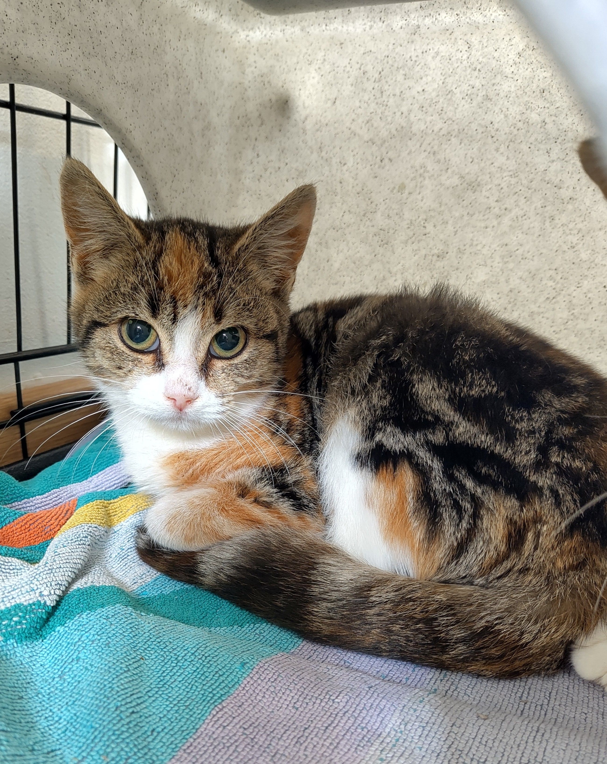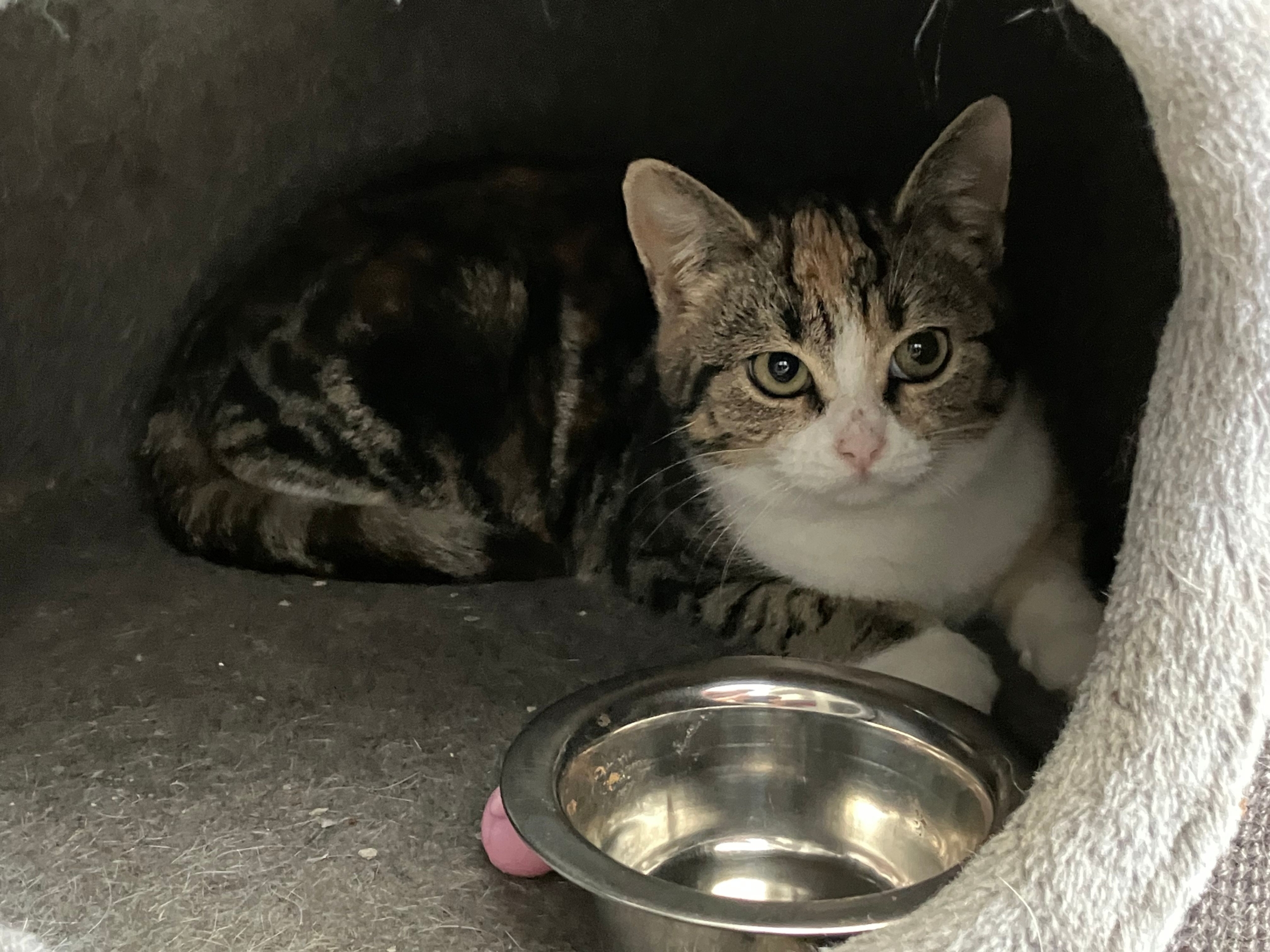 Deze cypers-rood-witte poes is Ruby, haar geschatte geboortedatum is 14 juni 2025. Ze is zwervend gevonden en niemand heeft zich voor haar gemeld dus ze zoekt nu een nieuw huisje.